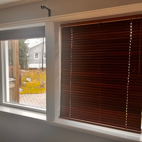 Tre stycken träpersienner, måttbeställda från PG:s persienn och markisservice. Trälist över kassett för snygg inramning. Mörkblåa band och snören.