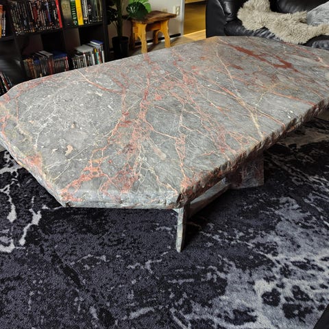Rektangulärt soffbord med svart underrede i metall och marmorskiva.