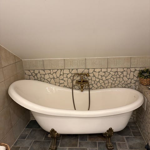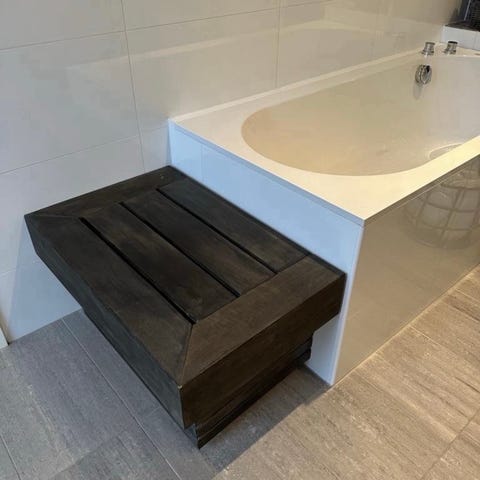 Ovalt träbadkar med vertikala träpaneler och förstärkande metallband runt om. Badkaret har slät insida i trä och är utrustat med bottenventil för avlopp. Passar för installation i badrum eller spa-miljö där man önskar ett fristående badkar i trä.