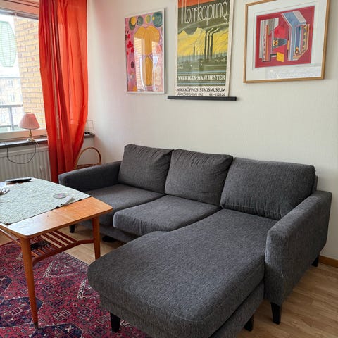 Säljes då vi inte får plats med schäslongdelen längre, det är alltså enbart schäslongen som säljes (exklusive armstöd).