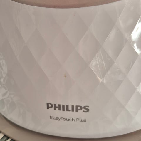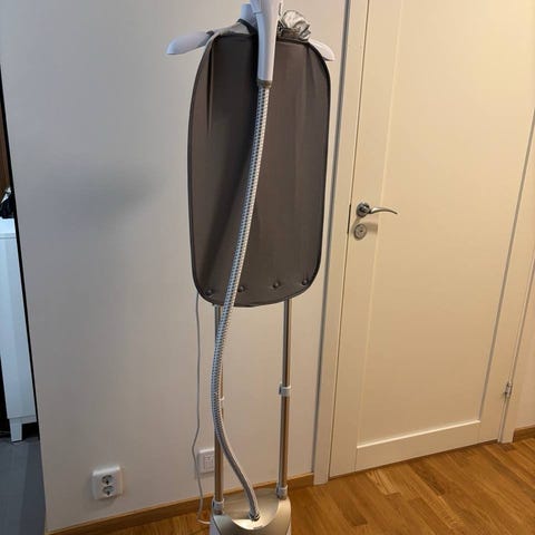 Philips klädsteamer för skonsam ångning av kläder. Golvmodell med vattenbehållare i basen, ångrör och inbyggd galge med värmeskyddande bräda. Utrustad med vred för inställning av ångnivå. Avsedd för vertikal ångning av skjortor, klänningar, byxor och andra plagg samt textilier som tål ånga. Ansluts med nätsladd till vägguttag.