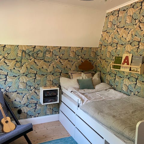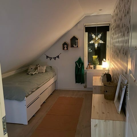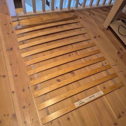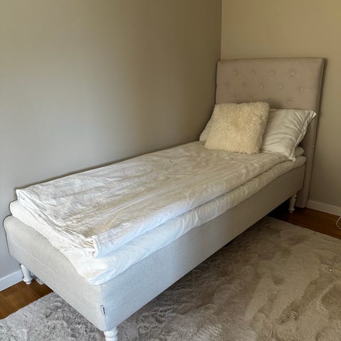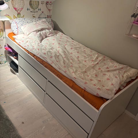 IKEA säng med förvaring och ribbotten. Sängen har en madrass ovanpå ribbotten och en ram med integrerade förvaringsutrymmen under liggytan. Förvaringen består av öppna fack på sidan av sängen som kan användas för till exempel leksaker, kläder eller andra tillhörigheter. Passar som enkelsäng i sovrum eller barnrum. Madrass och ribbotten ingår enligt bild.