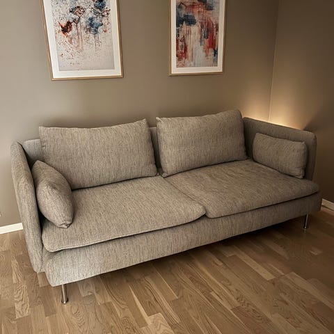 Soffa och fåtölj säljes. Inköpta på Trademax 2021 för 14,000 kr. Säljes för 5,000 (för båda). Bra skick.