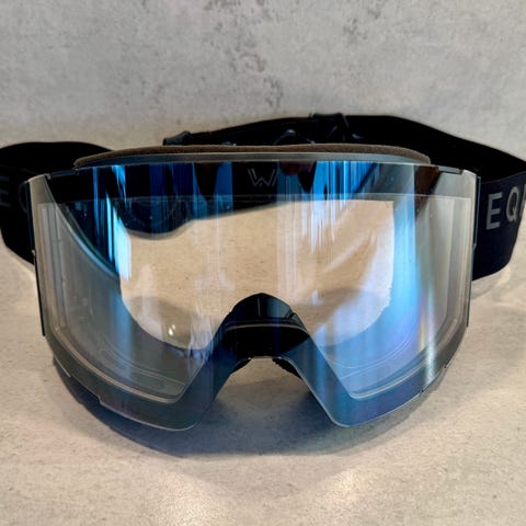 Wedze Lugik skidglasögon med blå ram och justerbart blått band. Glasögonen har rödtonat dubbelglas med märkning "double screen" och ventilationsöppningar upptill på ramen. Mjuk skumvaddering mot ansiktet för ökad komfort. Passar för skidåkning och andra vintersporter där ögonskydd mot vind och snö behövs.