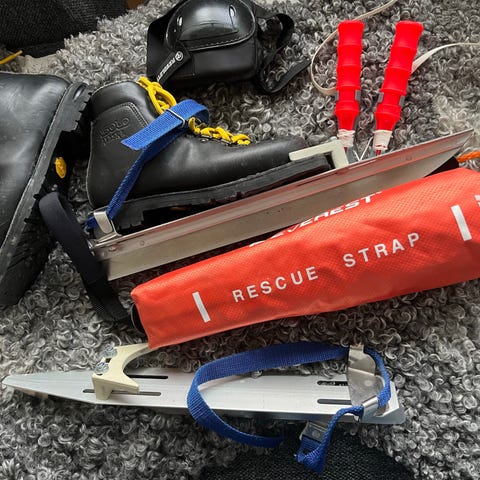 Skridskor: Lundhags 50 cm med ”klick-in-bindning” (kanske den bästa skridskon som Lundhags gjort) stadiga, utan remmar och lätta att ta av och på i toppskick Bra bett (behöver inte slipas i år)