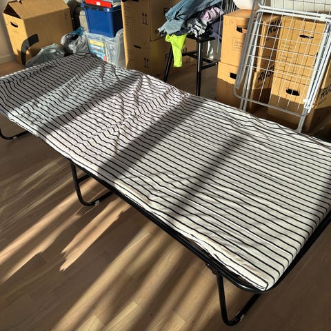 En hopfällbar extrasäng blå, metallben träribb-botten. 193x 80 cm. Madrass ca 10 cm. Använd endast några få gånger. Hämtas på Södermalm.