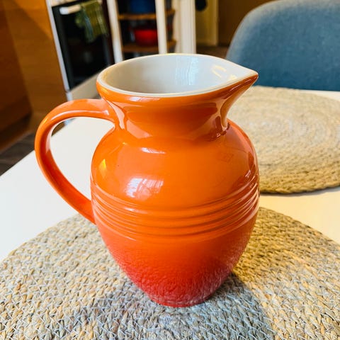 Le Creuset skål i stengods i orange färg med ljus insida. Skålen har emaljerad yta och är lämplig för servering av exempelvis sallad, frukt eller tillbehör vid matlagning och dukning. Märkning på undersidan visar Le Creuset-logotyp och storlekskod.