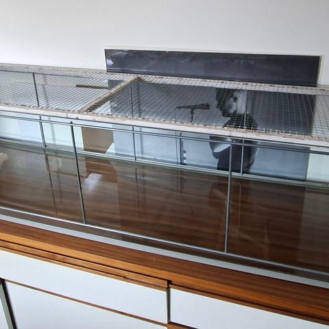 Bur till hamster, gerbil, möss och liknande smådjur. 96x47x47 cm. Taket går att öppna och stannar i öppet läge, vilket gör det lätt att städa och pyssla med djuren. Ena gaveln har bågnat lite, men det påverkar inte funktionen. Ett sandbad medföljer.