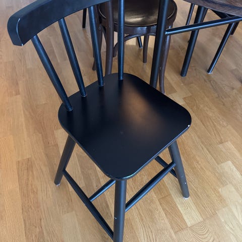 IKEA barnstol i svartmålat trä. Klassisk modell med ryggstöd bestående av flera spjälor och fyrbent underrede med tvärslåar som fotstöd. Passar som sittplats för barn vid matbord, skrivbord eller i lekrum. Sitsen är plan och rektangulär med rundade hörn, och stolen är anpassad för barnhöjd.