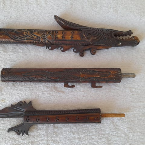 Japansk hjälmprydnad i form av en kabuto, tillverkad i tung metall med detaljerade drakmotiv. Hjälmen är monterad på en dekorativ kudde med mönstrat tyg och snörning i rött och orange. Flera reliefdetaljer och ornament finns runt visiret och på sidorna. Delvis förgylld. Passar som prydnadsföremål eller samlarobjekt med japanskt tema.