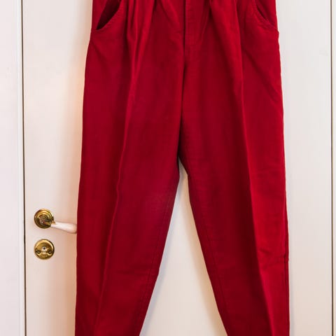 Röda byxor med resår bak i midjan. Byxorna har två fickor framtill och två baktill. Byxorna har en knapp och dragkedja i midjan. 100% Bomull