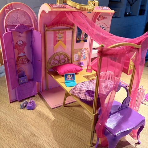 Barbie dockhus i rosa plast med flera rum och två våningar. Huset är hopfällbart och har öppningsbara väggar och dörr. Inredningen inkluderar bland annat stolar, bord, spegelbord, säng, toalett och köksdel.