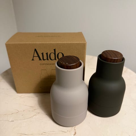 Audo Copenhagen kryddkvarnar i set om två. En kvarn i vit färg och en i svart/grå färg, båda med detaljer i trä på ovansidan. Kvarnarna kan användas för exempelvis salt och peppar eller andra torra kryddor. Passar för användning i kök och vid matbord.