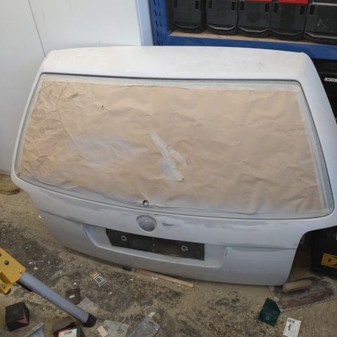 Golf 7 kombi. baklucka med gångjärn och bakruta utan bucklor, med lite kantrost längst ner.