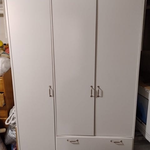 Vit garderob med två dörrar och tre utdragslådor. Ena sidan har en hel dörr som lämpar sig för hängande förvaring, den andra sidan har en smalare dörr ovanför lådorna som passar för hyllförvaring. Passar för förvaring av kläder, textilier och andra personliga saker i sovrum, hall eller förråd.