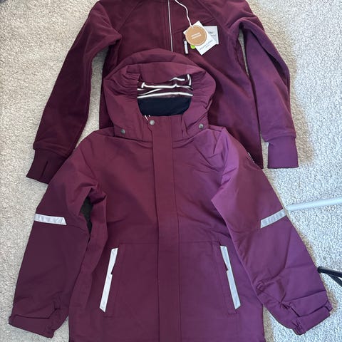 Fodrade svart vinterbyxor och tillhörande ljusrosa jacka med reflexer.