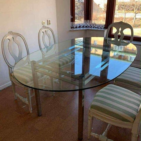Matbord i grått glas med 4 ben i metall. Diameter 105 cm, höjd 75 cm. Hämtas i Vasastan