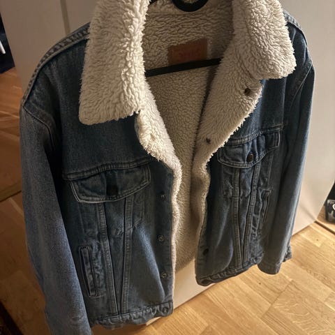 Levi’s 71500 jeansjacka för herr i storlek M. Jackan är tillverkad i blå denim med foder i teddy/plysch på insidan för extra värme. Klassisk modell med krage, knappstängning framtill och två bröstfickor med knappar samt sidofickor. Passar som ytterjacka i svalare väder.