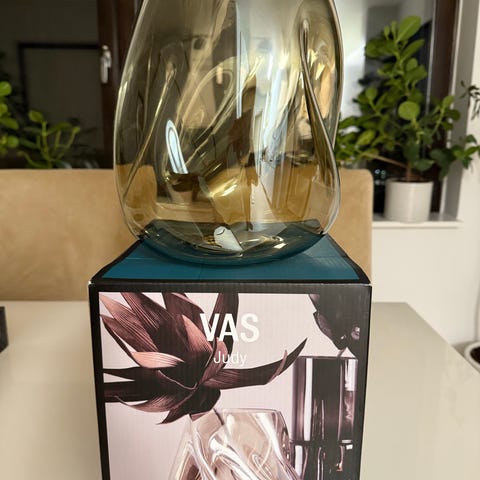 Konstruktionen består av genomskinliga glassidor monterade i en ram, placerad på en rektangulär bas. Insidan har en speglande yta som ger reflektioner och dekorativ effekt. Passar som inredningsdetalj på bord, hylla eller fönsterbräda i hem eller kontor.