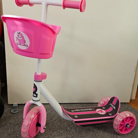 STIGA sparkcykel med tre hjul i rosa och vitt. Utrustad med frammonterad korg, två hjul bak och ett fram för ökad stabilitet. Lämplig som leksakssparkcykel för mindre barn. Plast- och metallkonstruktion med fotplatta i svart och rosa samt genomskinliga hjul.