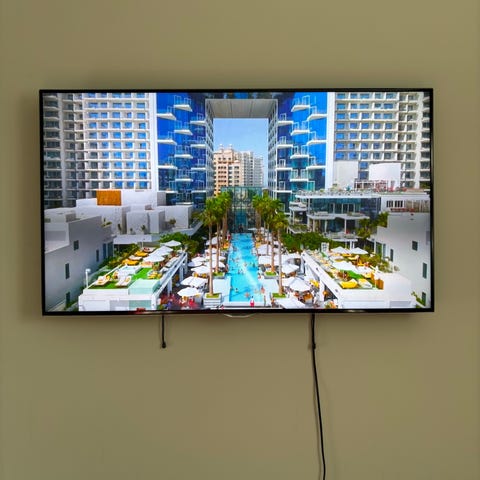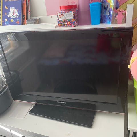 Samsung tv med platt skärm. Tv:n har en rektangulär fot/stativ som syns på bilderna. Passar för användning i vardagsrum, sovrum eller andra rum där man vill ha en skärm för tv-tittande eller anslutning av externa enheter via tillgängliga portar på baksidan (ej specificerade på bilderna). Storlek och modell är inte angivna.