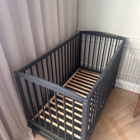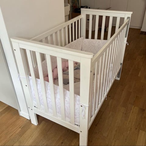 Äldre spjälsäng från BRIO med dropside för madrass 120x60cm.