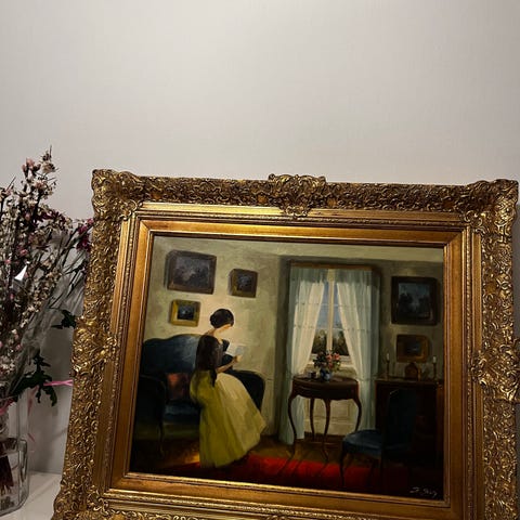 JAN VERMEER. REPLIK. Kvinna vid fönster, olja på duk. 750x950mm. Fantastisk oljemålning med en ram som förgyller verket. Notera gärna auktionspris på sista bilden, en mindre version, detta verk är större. Antik.
