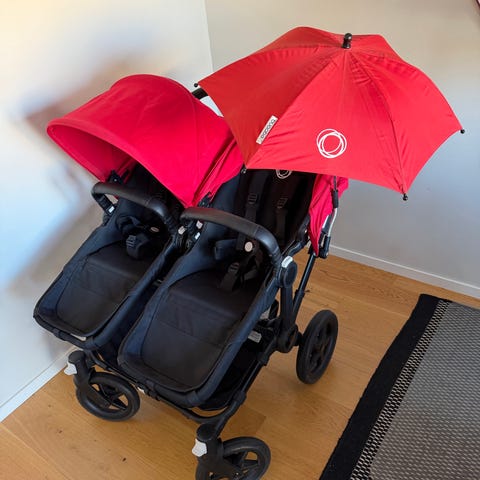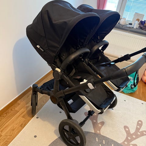 Bugaboo Donkey5 Duo i Stormyblue. Tagit väl hand om vagnen, men finns spår av användning på chassit.Utöver det finns det inga skador på vagnen/tyget.