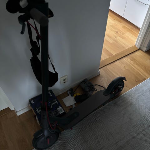 NIU KQi2 Pro elsparkcykel i svart färg. Modellen har ståplatta med halkskydd och integrerad display vid styret som visar batterinivå. Utrustad med handbromsar, ringklocka och belysning fram. Levereras med laddare enligt bild och lämpar sig för pendling och kortare resor i stadsmiljö. Vänstra bromsa har släppt men höger funkar .