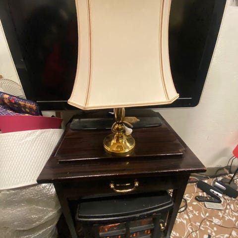Bordslampa tidigt 1900-tal i mässing med skärm av glas. Höj och sänkbar. 800kr