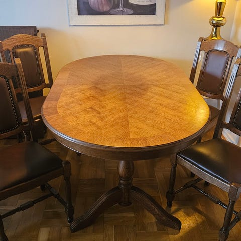 Vackra matsalsstolar i svartbrunt trä med vinröd skinnklädsel. Köpta secondhand för tre år sedan. Bekväma och hela, lite skönhetsdefekter finns men inget som påverkar funktionen, se bilder.