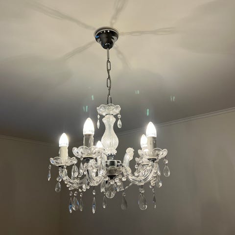 En fin kristallkrona med mycket vackra kristallprismor. Kristallkronan har 2 rader utav lampor och armar. Den har komplett 9 styckna ljusarmar. Höjden komplett med kedjan till taket är 1 meter och diameter är 60.. Pris 750 kronor
