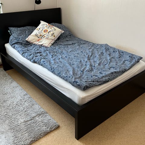 IKEA säng i svart utförande. Sängen har en rak, hög gavl och låg fotända. Passar som enkelsäng i sovrum, gästrum eller tonårsrum. Ram i trä/träbaserat material med slät yta. Madrass och sängkläder på bilderna kan användas som referens för storlek och proportioner, men ingår endast om det anges separat i annonsen.