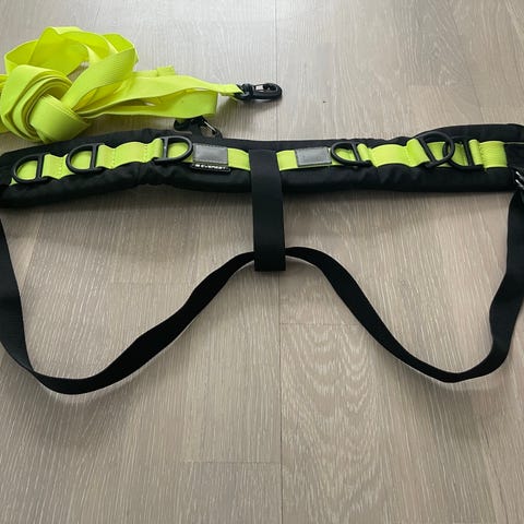 Fästes runt midjan och benen på barnet för ett säkert grepp med jämnt fördelat tryck. Linan kan fästas vid olika punkter på selen för varierande rörelsefrihet/svårighetsgrad.