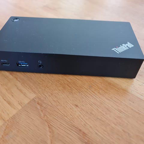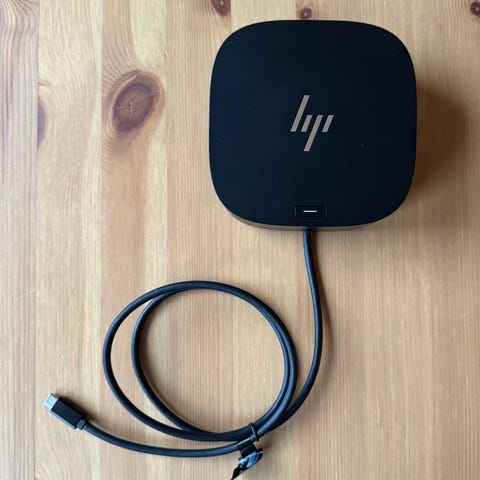 Dockningsstationen ansluts till datorn via fast USB‑C‑kabel. Dock är sladden sönder och behöver bytas.