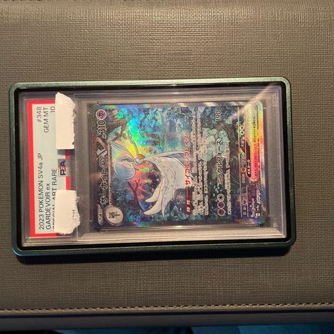Pokémon Acerola's Mischief SIR samlarkort på engelska från serien Mega Evolution. Kortet är graderat av RaukCard med betyget 10 Gem Mint, enligt etiketten. Kortet är inkapslat i ett hårt plastfodral från graderingsföretaget, vilket skyddar det mot slitage. Lämpligt för samlare av Pokémonkort som vill ha ett graderat exemplar av tränarkortet Acerola's Mischief i specialillustrerad version (SIR).