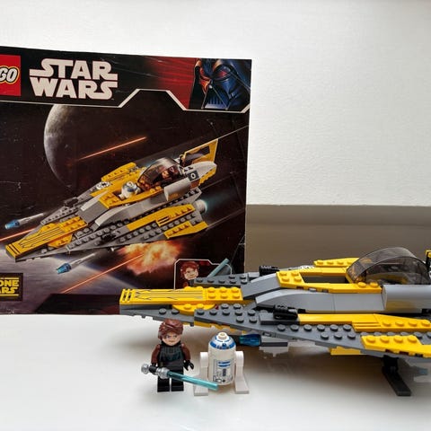 LEGO Star Wars rymdskepp med flera minifigurer och tillbehör. Setet innehåller ett större gult och grått rymdskepp, mindre fordon samt olika figurer och droidfigurer. Passar för lek och uppbyggnad av Star Wars-inspirerade scener i LEGO-miljö.