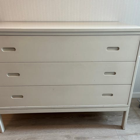 Byrå från IKEA helt i trä med fyra lådor. Själva möbeln är i mycket gott skick, ursprungligen vit, men handmålad i klarare blå än fotot visar. Rök- och djurfritt hem. Samma möbel finns även i vitt, bör dock målas om. Den vita byrån kostar 250 kr.