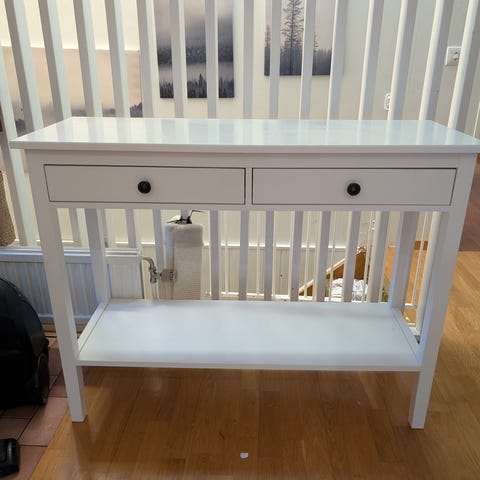 Vit skänk / Hallmöbel i massivt trä med fyra lådor och en nedre hylla. Skänken har släta lådfronter med runda metallknoppar och en rak, enkel design. Passar som förvaringsmöbel i exempelvis hall, sovrum eller vardagsrum för förvaring av mindre saker på hyllan och i lådorna.