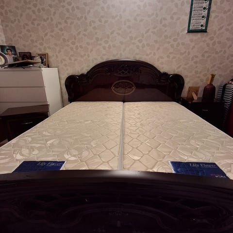 Resårbottnar och en hel bäddmadrass medföljer, sparsamt använda