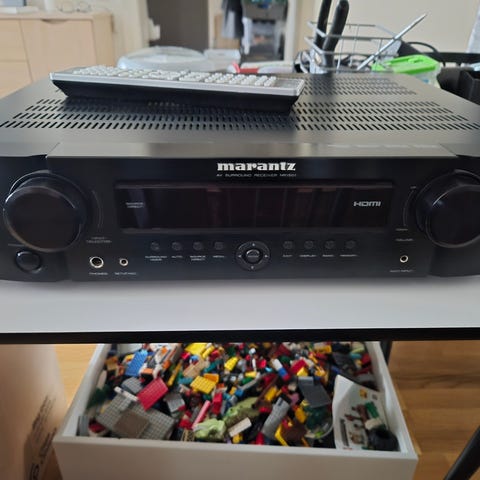 Hemmabioreceivern från Marantz har frontpanel med två stora reglage, flera ingångar på framsidan samt ventilationsgaller på ovansidan. Den är avsedd för anslutning av flera ljud- och bildkällor och kan driva passiva högtalare.