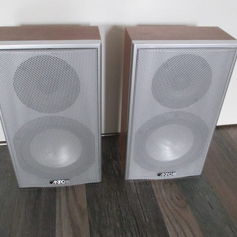 Högtalarpaketet från Canton består av golvstående högtalare, centerhögtalare och subwoofer i matchande silverfärg. Centerhögtalaren är märkt Canton CD 250, 4–8 ohm. Högtalarna är avsedda för hemmabioanvändning och ansluts med högtalarkabel via skruvterminaler på baksidan.