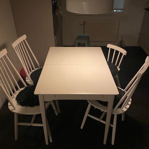 Säljer ett stilrent Haslev Symphony matbord 90x90 cm med tillhörande iläggsskiva 46x90 cm samt 4 pinnstolar.