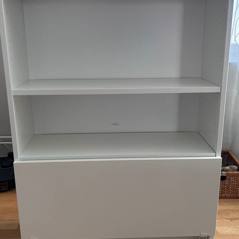 Fin vit Ikea Billy bokhylla i nära nyskick. Endast en flyttbar hylla har knappt synliga fettfläckar (se sista bilden). Sätter man den hyllan överst så syns de inte alls.