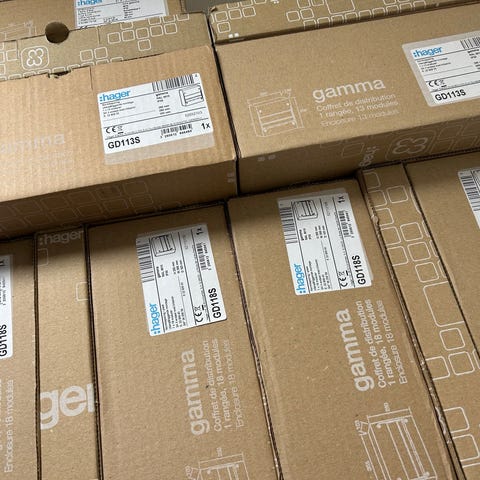 Elcentral kapslad i vit färg. Utrustad med flera dvärgbrytare och huvudbrytare samt plats för ytterligare moduler. Passar för fördelning av el i bostad eller mindre anläggning. Kapslingen är avsedd för väggmontage och har utrymme för kabeldragning på insidan. Exakta tekniska data som märkeffekt, antal faser och kapslingsklass framgår inte av bilderna och bör kontrolleras på plats eller via märkning på produkten.