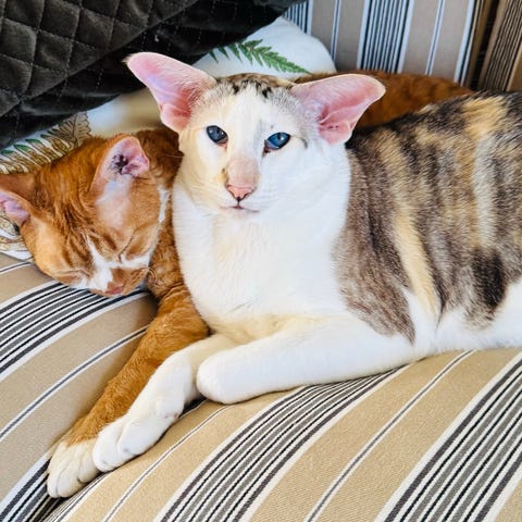 Mys och tvättning kan hända sporadiskt och de delar på både klösträd och kattlåda utan minsta problem.