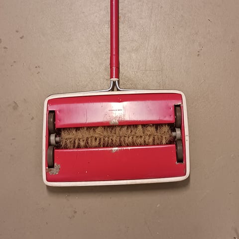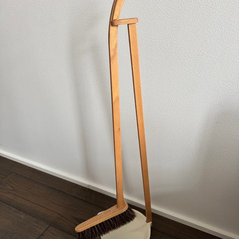 Ett set med en röd sopborste och en röd skyffel som det går att hänga upp sopborsten på. Välanvänt.