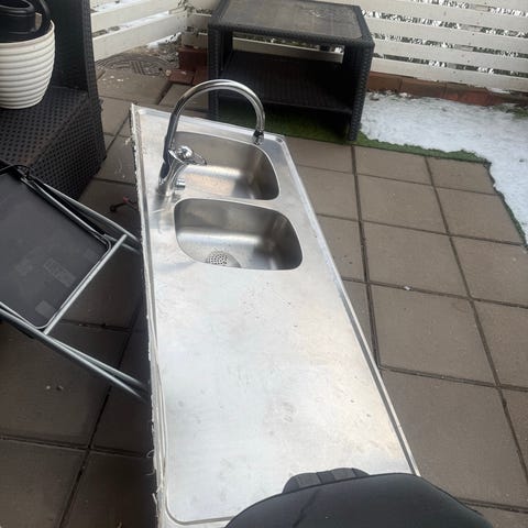 Diskbänk i rostfritt stål med dubbel ho och integrerad blandare. Lång arbetsyta som passar för kök, tvättstuga eller utekök. Rostfritt material är lätt att rengöra och motståndskraftigt mot fukt. Två hoar underlättar separering av disk och sköljning.måste bort hel fungerande ingen bukta eller skadad med vattenlås rör hela komplett allting fungerande först i kvarn 300kr