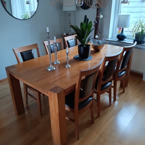 Stort och gediget ekbord i massivt trä, köpt på EM Möbler.