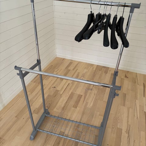 Nikkeby IKEA klädställning med hylla i grön metall. Ställningen har en klädstång upptill för galgar och två nät-/gallerhyllor nedtill för förvaring av till exempel skor, lådor eller andra saker. Mått enligt skiss: höjd cirka 170 cm, bredd cirka 83 cm och djup cirka 40 cm. Passar i hall, sovrum eller förråd för upphängning och förvaring av kläder och accessoarer.